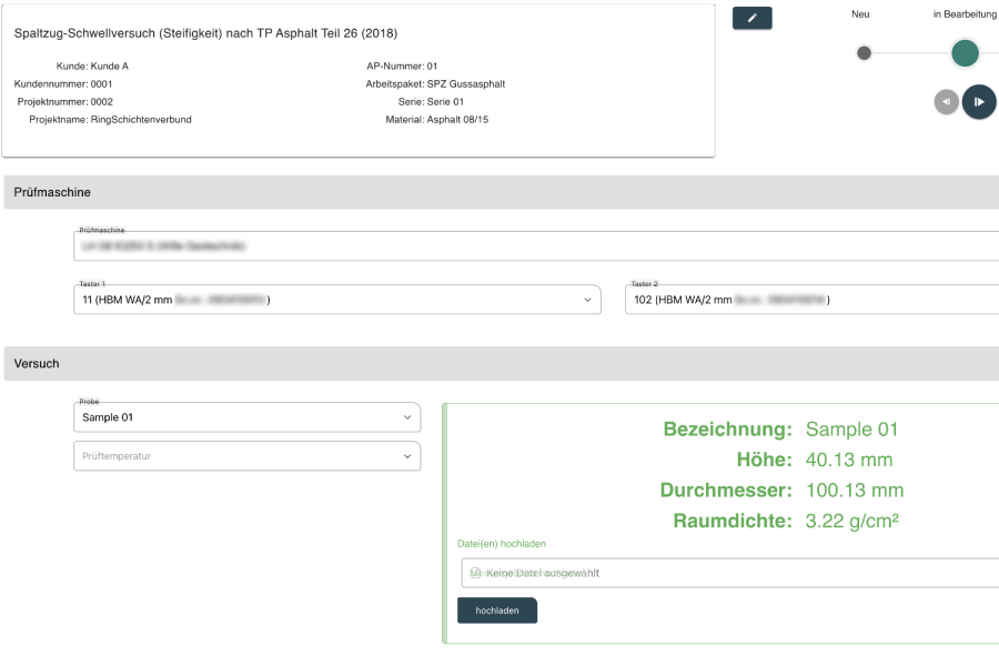 Im Moment der Prüfung unterstützt paveit den Nutzer mit relevanten Informationen. Der Nutzer definiert die Prüfmaschine sowie die notwendigen Messmittel. Diese Informationen werden zusätzlich als Metadaten zu den Messergebnissen gespeichert und ermöglichen eine kontinuierliche Nachverfolgung zur Erhöhung der Qualität und Transparenz gegenüber den Kunden. Der Nutzer wählt eine individuelle Probe aus und definiert ggf. zusätzliche Prüfbedingungen. Auf Basis dieser Auswahl zeigt paveit notwendige Parameter wie Durchmesser oder Höhe der Probe an.